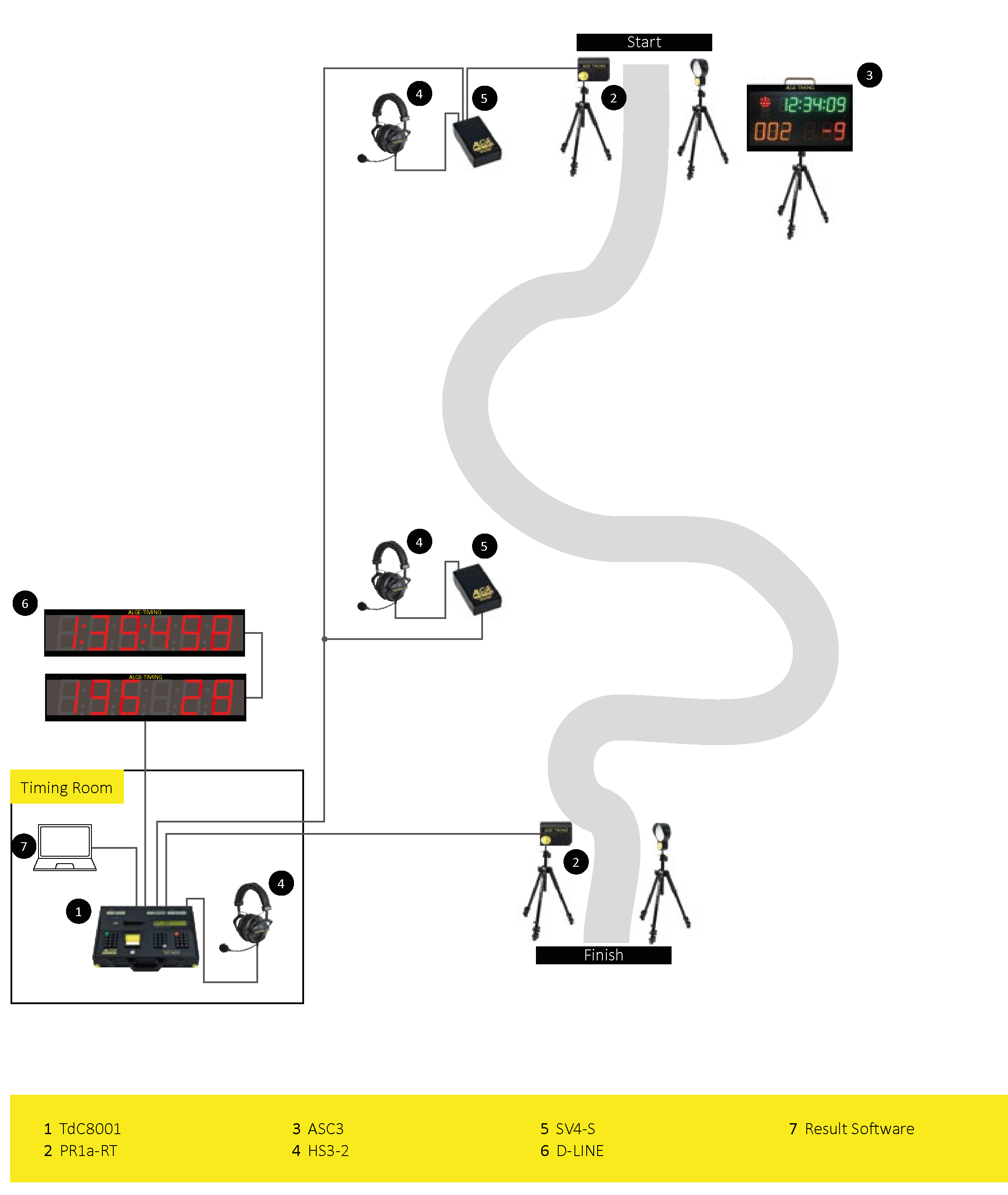 The Startclock ASC3 belongs to the accessories in timed races because it helps to regulate the start sequence: the time is started by an antenna switch at the start, measured by the TdC8001 timing device and stopped at the finish by a photocell. When the start is close to the finish line, the starter and the timing operator can connect using a headset. The judge or announcer at the finish line can tell the bib number of arriving cyclists to the timing system operator.