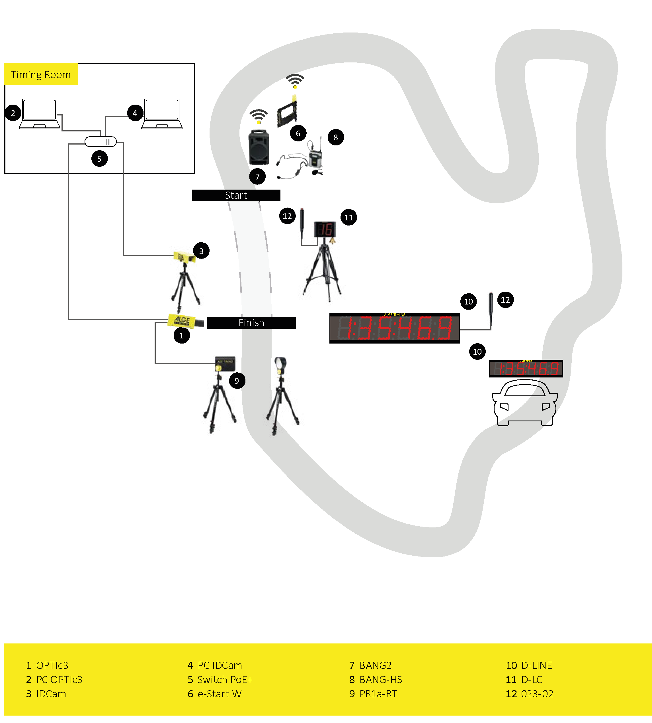 In a road race, the start is triggered by an electronic starting gun and a lap counter determines the number of laps to finish. A display screen is mounted on the roof of the vehicle to make the results visible to spectators and competitors. At the finish line, a photocell automatically records the athlete's time and manages the recording of the photo finish and IDCam. Scoreboards with the result time and the leader's time difference can be attached before the finish line.