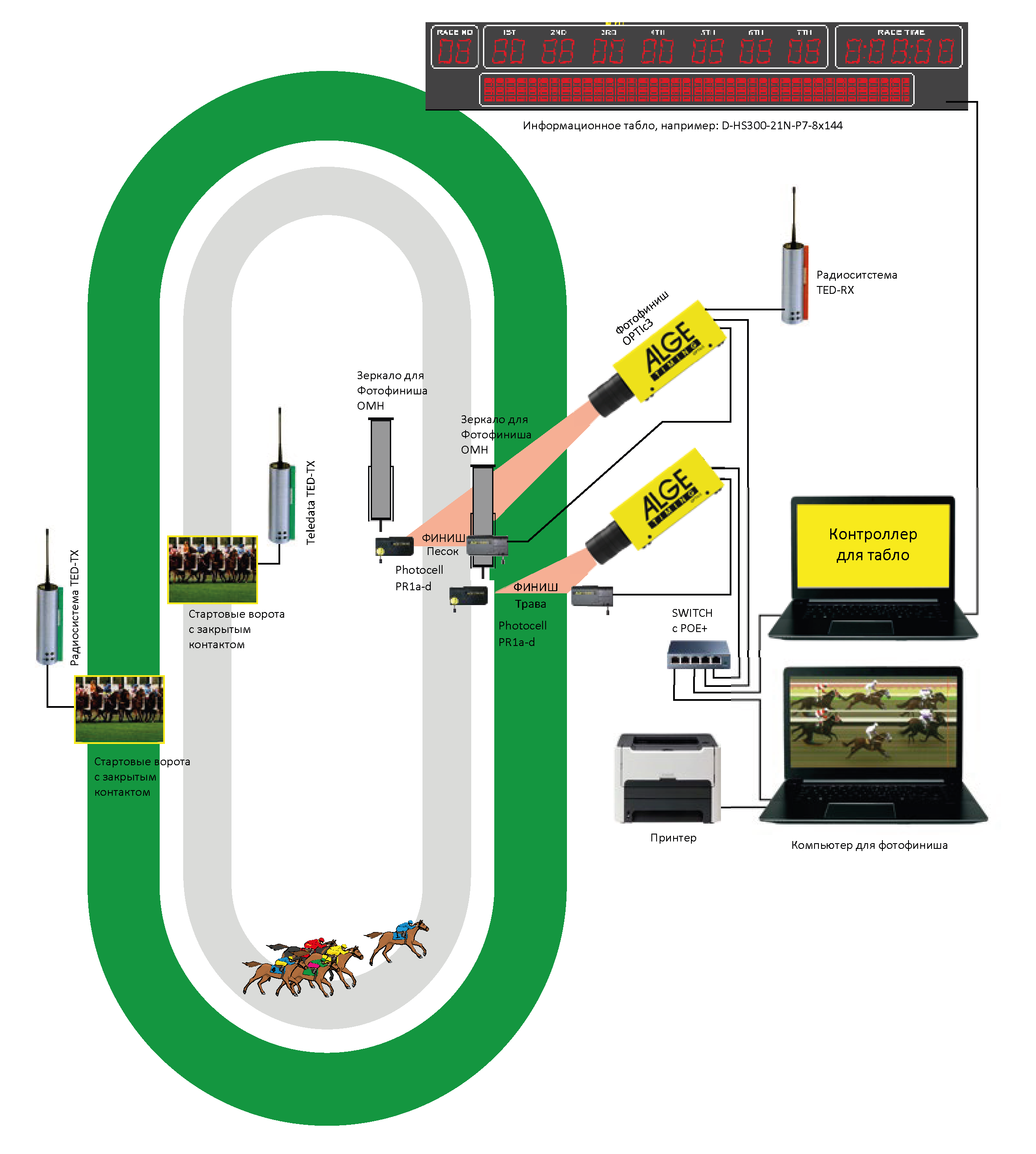 Races can take place on one or more tracks. If only one OPTIc3 photo finish camera is used, it must be set to the main finish line. It is possible to use one photo finish camera per finish line. In addition, the paths can be equipped with light bars, radio transmitters, screens and a video broadcast system.