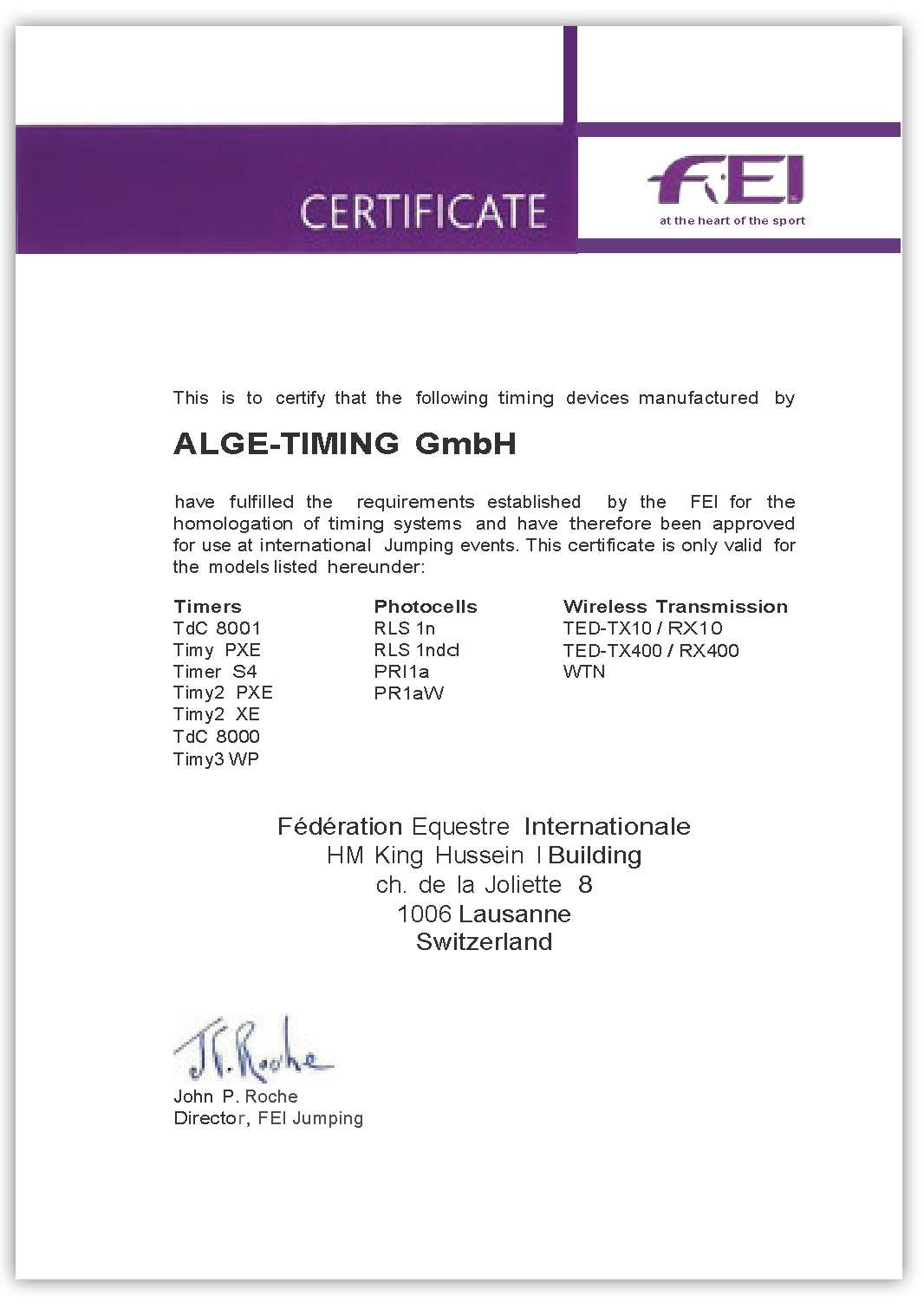 FEI (International Equestrian Federation) Certificate Only certified timing systems can be used in international competitions organized according to the rules of the International Equestrian Federation (FEI). For this reason, all devices offered by ALGE-TIMING for equestrian sports are FEI certified.
